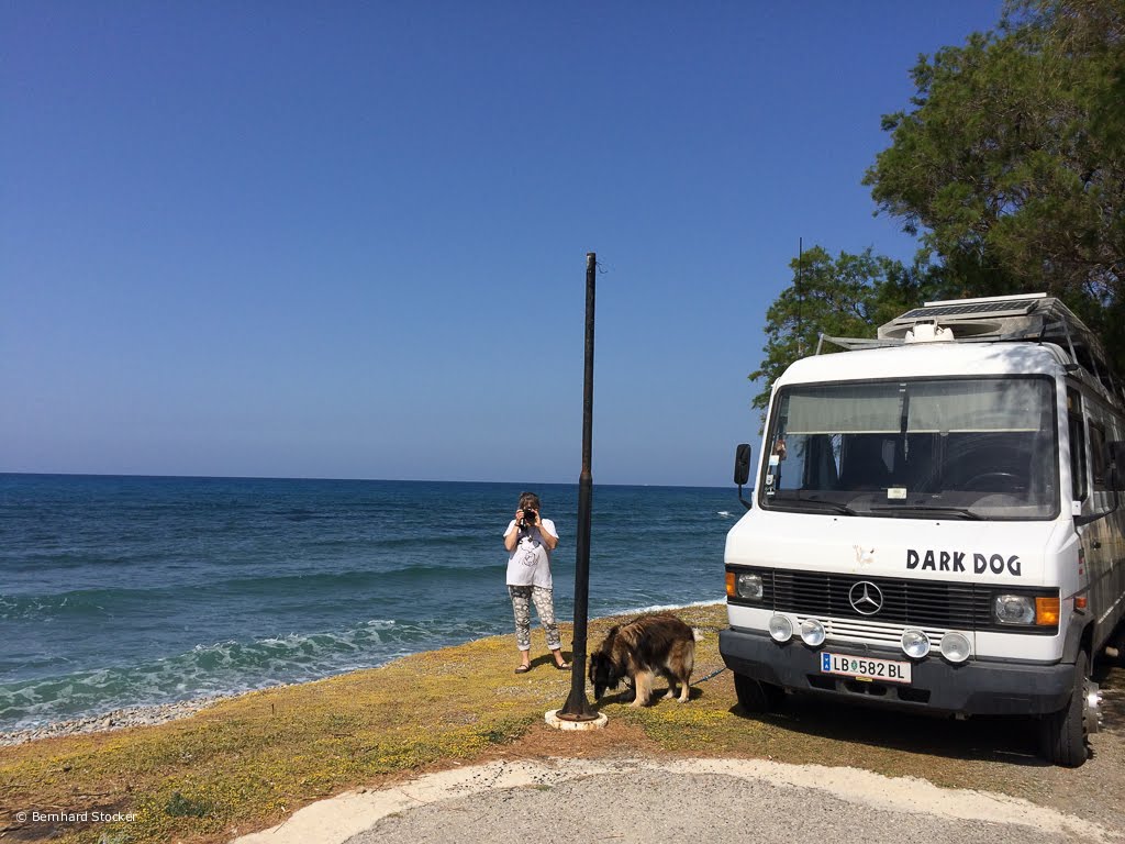 Gut versorgt bummeln wir zu unserem Tagesziel, den Strand von Tavronitis. Die Steine rollen in der Brandung, die Infrastruktur hat auch schon mal bessere Tage gesehen. Es ist ruhig und warm und wir haben den Platz fuer uns allein. Prost!